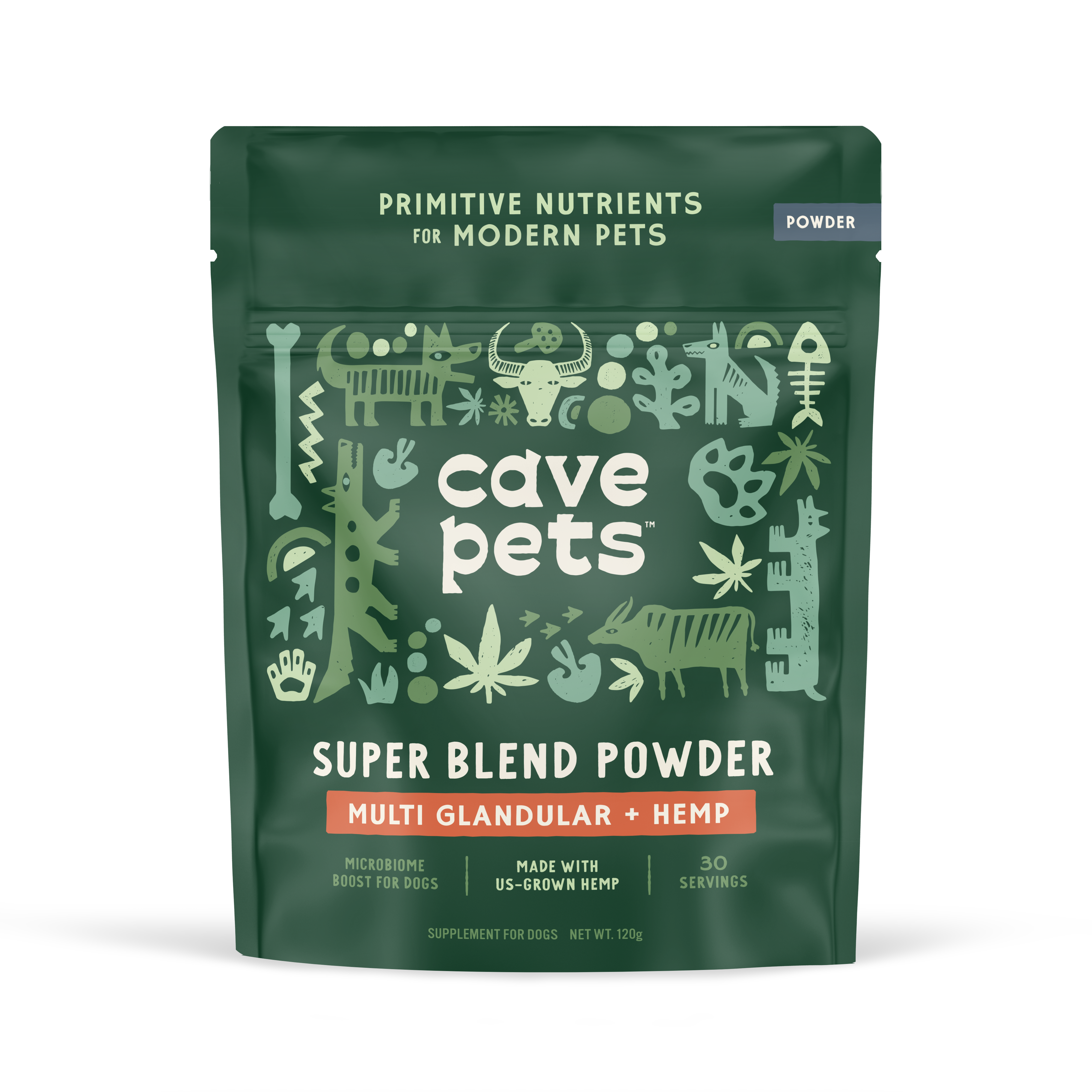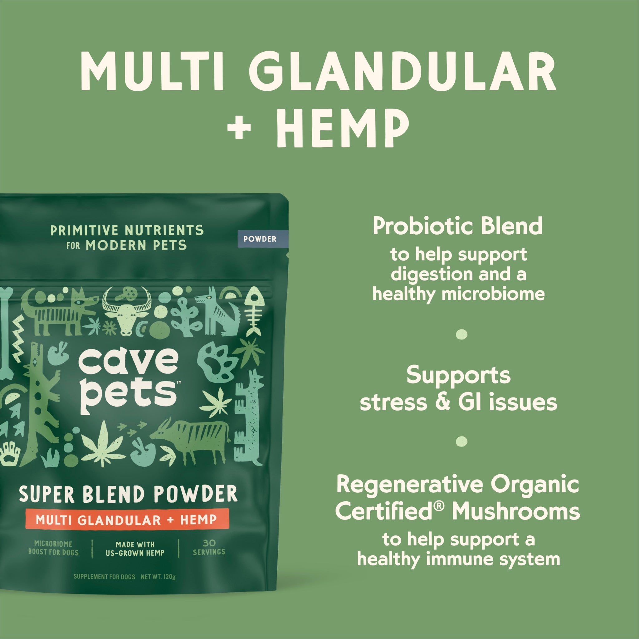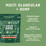 Super Blend Powder: Multi-Glandular + Hemp provides your Cave Pet with a combination of synergistic nutrients - including organic ashwagandha extract, organic mushrooms, naturally sourced minerals and HEMP proteins that help promote natural relaxation and support healthy gut function. Can be used daily to support overall wellness or as needed during times of stress.