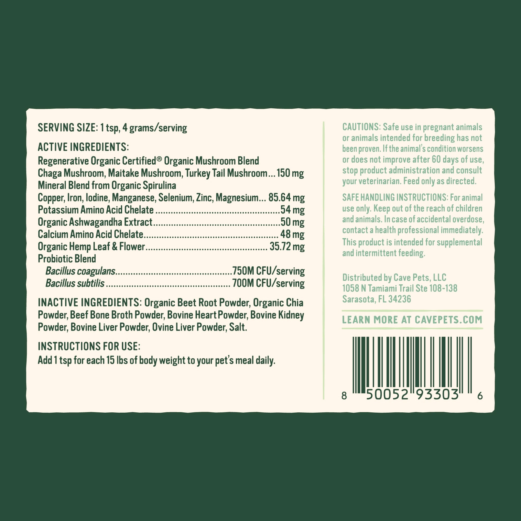 - A combination of Regenerative Organic Certified® mushrooms to bring specific benefits to support your Cave Pet’s healthy immune system, optimal wellness and balance.