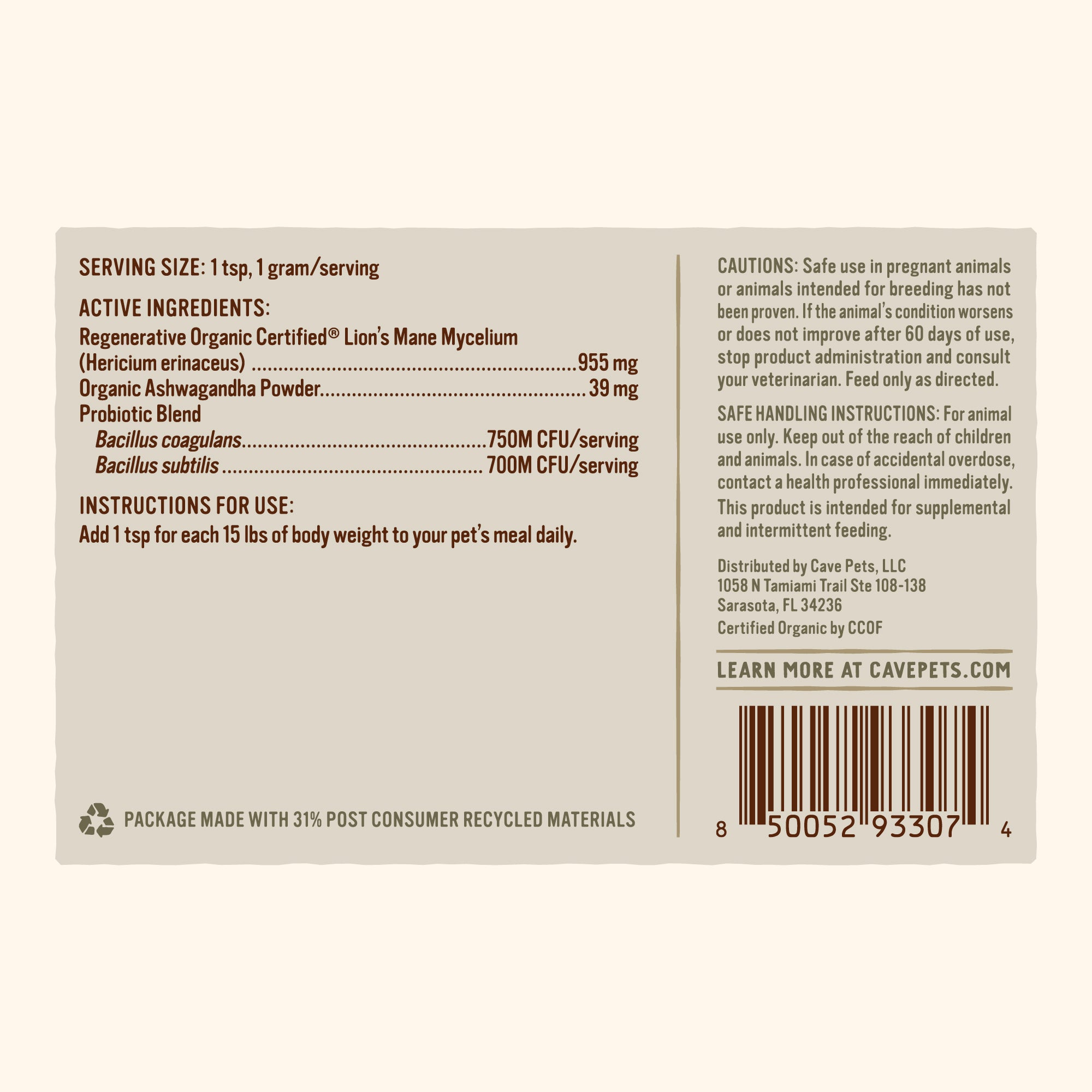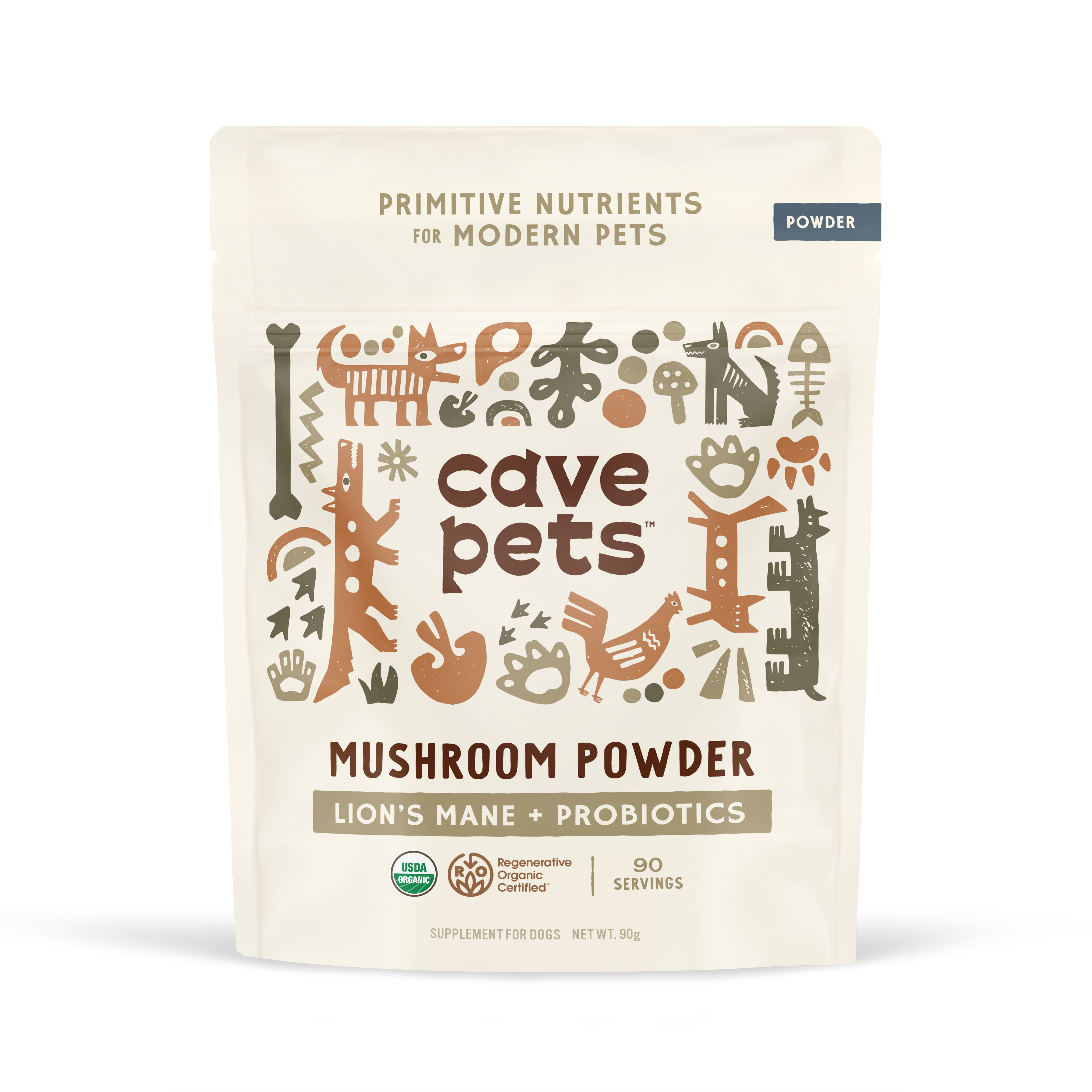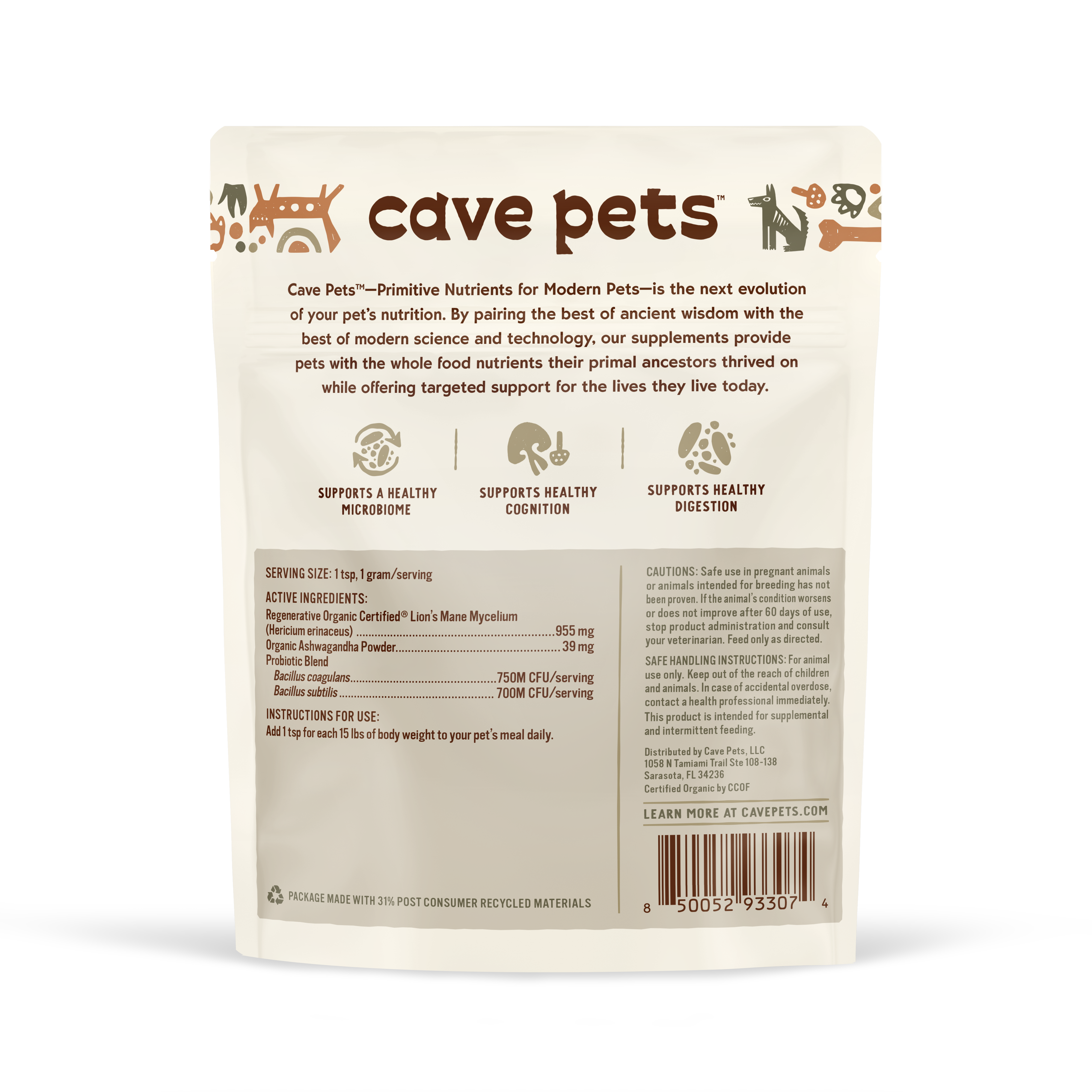 Cave Pets Super Blend Powder: Lion’s Mane + Probiotic powder can help support overall brain health, cognition, and digestion with Regenerative Organic Certified® Lion’s Mane Mushrooms and probiotics.